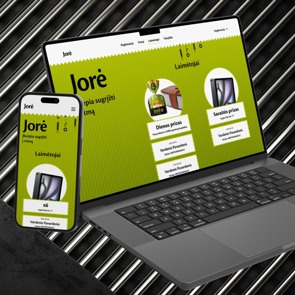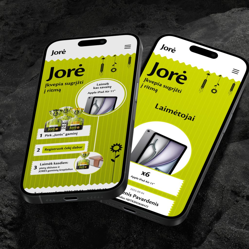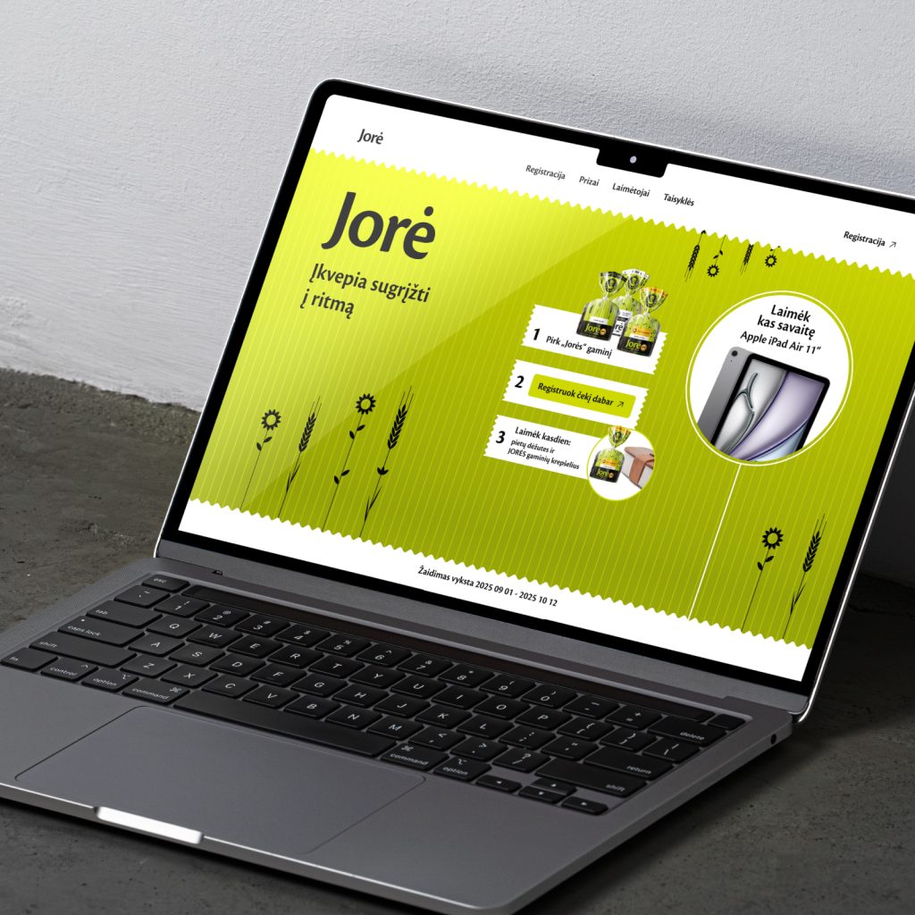 The “JORĖ” team approached us to implement the online platform for the promotional game “JORĖ inspires you to get back into rhythm.” The goal was to create an attractive design, ensure a user-friendly technical solution, and launch a system that allows users to register purchase receipts, participate in daily and weekly prize draws, and track results.